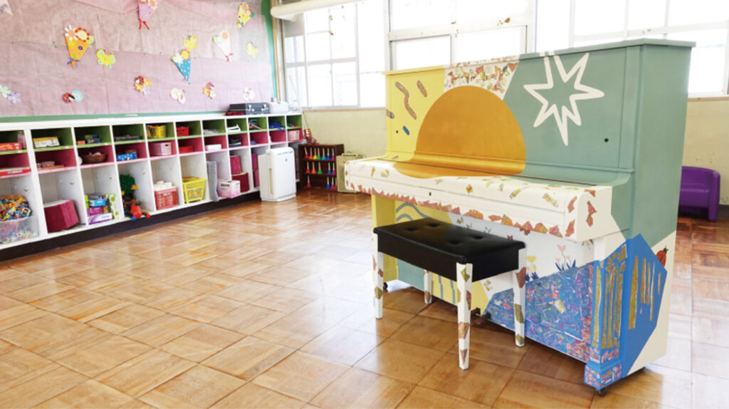 この作品には設置されるこの場所(庁舎)で一番身近に感じてもらうことになる市職員の方にもたくさん関わっていただいています。作品の名前である「Re:ピース」は、たくさんのイメージを出し合いながら市職員さん達がつけた名前です。『園がなくなることはさみしいけれど、みんなで描いた絵がピアノを彩るカケラ(ピース)となり、そのピアノが新しい役割を持って、生まれ変わりますように』という願いが込められています。