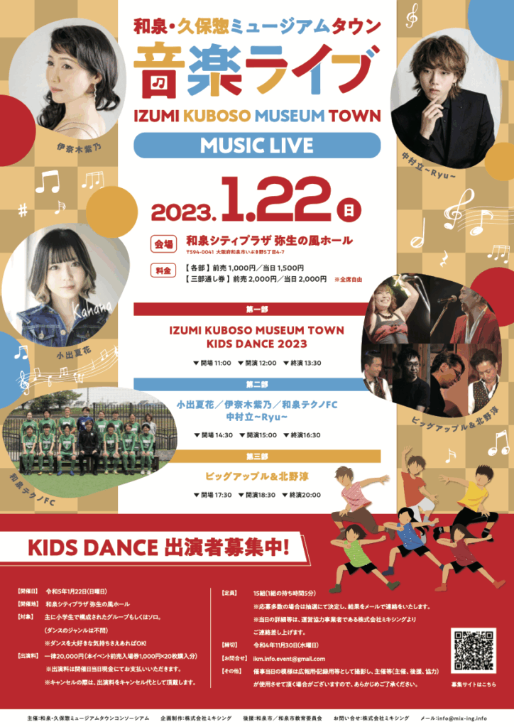 このたび、アーティストが活動できる場所、集うことができる交流の場所、そして音楽に親しみ、発表できる機会として、『和泉・久保惣ミュージアムタウン 音楽ライブ〜IZUMI KUBOSO MUSEUM TOWN KIDS DANCE 2023〜』を令和5年1月22日(日曜日)に開催します。